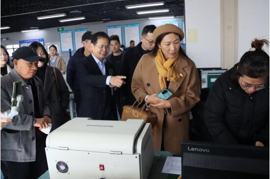 隨后,考察團一行深入生產車間。在生產測試區,專家們表現出了濃厚的興趣,重點考察了天瑞儀器的EDX-T鍍層測厚儀和EDX3000PLUS X熒光貴金屬檢測儀。劉博士現場為考察團演示了設備操作,并詳細講解了這兩款儀器的技術優勢與應用場景。成都表面工程協會考察團一行對天瑞儀器的技術實力和產品性能給予了高度認可。