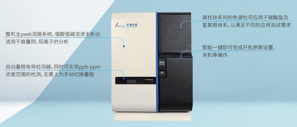 TIC-680離子色譜儀是天瑞儀器在TIC-600的基礎上,推出的全新一款具有雙極電路、電磁閥進樣、可搭載自動淋洗液發生器、同時可兼容安培檢測器、紫外檢測器等,滿足不同的樣品測試需求。該款產品搭載淋洗液自動發生器可實現梯度洗脫,滿足新國標GB5750.10-2023生活飲用水中消毒副產物的測定;除此之外該產品既能滿足常規陰離子、陽離子、氰根及小分子有機酸的分析,也能與AFS、ICP、ICP-MS聯用進行形態分析;普遍適用于環境、疾控、食品、電子、化工、醫藥、礦冶等領域。