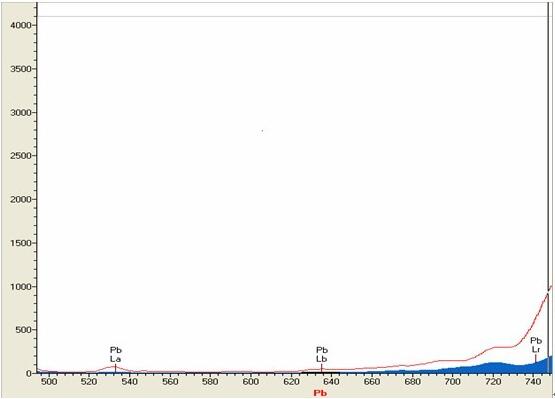 下圖實譜表示純銅rc101(Pb,0ppm)即本底、紅色虛譜為 鎳白銅313(Pb:60ppm)