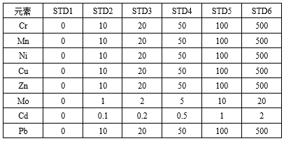 土壤中的元素經微波酸式萃取至溶液中,利用電感耦合等離子體質譜儀進行檢測,涉及的過程為:土壤樣品采取硝酸/鹽酸/氫氟酸/過氧化氫四酸體系,利用微波消解儀進行消解,制備成樣品溶液;所得的樣品溶液經霧化器霧化成氣溶膠,再通過霧化室篩選合適粒徑的氣溶膠送入炬管,在炬管高溫等離子體火焰中電離形成待測離子,再經過接口室進入質譜系統,分別經過離子透鏡系統,四極桿質量分析器,檢測器;其中檢測器對進入的離子進行響應,檢測電路將響應信號轉化成計數率(cpscounts per second)。再結合內標法對待測元素進行定量分析,得到最終含量。