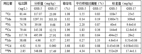 采用ICP-MS2000E電感耦合等離子體質譜儀測定土壤標準物質中CrMnNiCuZnMoCdPb八種金屬元素含量,檢出限在2.85-117.76 ng/L之間,穩定性在0.60%-3.68%    之間,各元素測試結果與標準值相符,能夠滿足第三次全國土壤普查中關于電感耦合等離子體質譜法檢測上述各元素的要求。
