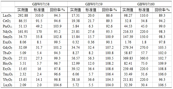 參考《GB/T 40798 離子型稀土原礦化學(xué)分析方法 稀土總量的測定 電感耦合等離子體質(zhì)譜法》,采用氫氟酸、硝酸、高氯酸進行濕法消解。利用碰撞反應(yīng)模式控制氧化物產(chǎn)率,降低輕稀土氧化物/氫氧化物對其他稀土元素的干擾;并根據(jù)實際樣品中元素含量,校準(zhǔn)稀土氧化物/氫氧化物的干擾。對三個稀土礦標(biāo)準(zhǔn)物質(zhì)中14種稀土元素(以氧化物形式表示)進行測試,各元素回收率為86.6 %~109.9%。