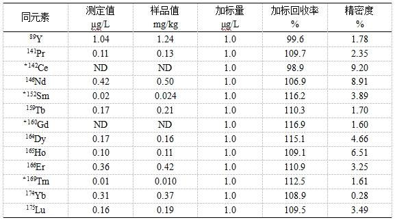 參考《GB/T 18115.1-2020 稀土金屬及其氧化物中稀土雜質(zhì)化學(xué)分析方法 第1部分:鑭中鈰、鐠、釹、釤、銪、釓、鋱、鏑、鈥、餌、銩、鐿、镥和釔量的測定》,將高純氧化鑭用稀硝酸溶解,利用內(nèi)標(biāo)法進行校正。考察加標(biāo)回收率及精密度。方法加標(biāo)回收率為98.9%~116.9%,精密度為0.28%~9.20%。