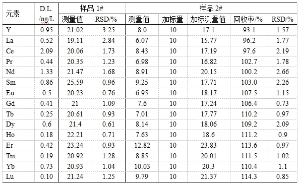 油田稀土示蹤劑主要用來考察油田井間的導(dǎo)通性,具有無放射性、安全穩(wěn)定、用量少、分析精度高等特點。將所得油田水樣搖勻過濾,稀硝酸稀釋一定倍數(shù),以內(nèi)標(biāo)法校正樣品基體對待測同位素影響,考察Y、La、Ce等15種稀土示蹤劑的檢出限、精密度(以RSD表示)、加標(biāo)回收率。發(fā)現(xiàn)檢出限為0.10~2.09ng/L;樣品1#的精密度為0.61%~3.25%;樣品2#中各元素加標(biāo)回收率為93.1%~114.3%,精密度為0.85%~2.66%。