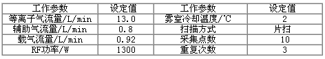 以10.0ng/mL Li 、Co 、In 、Ce 、U 和Bi混合調(diào)諧液優(yōu)化儀器工作參數(shù),使儀器靈敏度最佳,同時確保氧化物及雙電荷產(chǎn)率低于3%,具體工作參數(shù)見表1。在儀器最佳工作參數(shù)條件下,以內(nèi)標(biāo)法進(jìn)行測試。