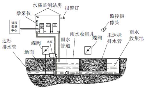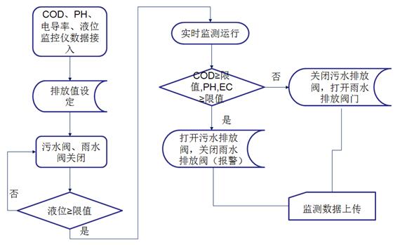 監(jiān)測系統(tǒng)控制采樣單元將水樣導(dǎo)入監(jiān)測室,并啟動監(jiān)測水質(zhì)的CODpH、電導(dǎo)率等常規(guī)參數(shù)。達(dá)標(biāo)雨水通過電控閥門排入市政雨水管網(wǎng),一旦超標(biāo)電控閥門關(guān)閉,禁止雨水排入市政雨水管網(wǎng),并通過水泵將超標(biāo)雨水泵入企業(yè)污水處理系統(tǒng)處理,達(dá)標(biāo)后排放至市政污水管網(wǎng)。同時所有監(jiān)測數(shù)據(jù)經(jīng)由數(shù)據(jù)采集單元將數(shù)據(jù)統(tǒng)計后,由傳輸設(shè)備傳輸至企業(yè)監(jiān)測中心或環(huán)保局,由此完成對雨水排放自動、實時、連續(xù)監(jiān)控。