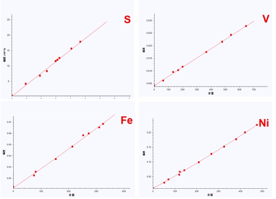 圖2:S、V、Fe、Ni元素含量與強度線性關系圖