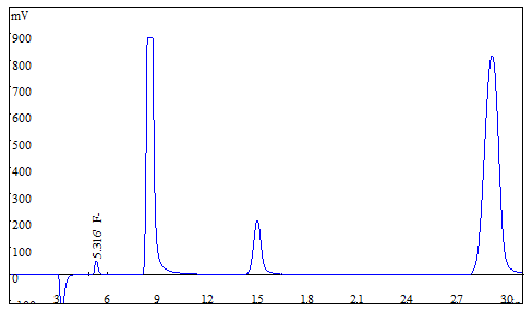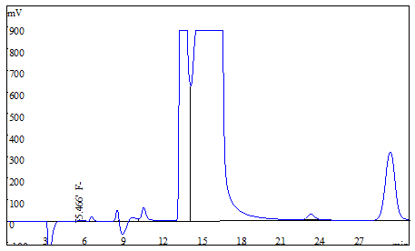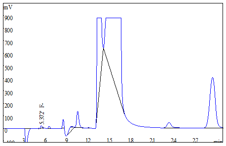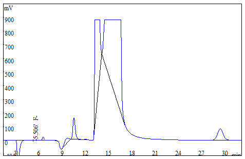 將大米、茶葉試樣分別粉粹后過篩,各稱取0.25g(精確至0.0001g),于氧彈燃燒儀進行燃燒,冷卻后定容,經0.22μm的水系濾膜過濾后上機得到樣品譜圖,如下圖3、圖4所示;食用油樣品直接稱重后進行氧彈燃燒,測試得到的譜圖如圖5所示;生活飲用水直接上機后得到樣品譜圖詳見圖6。其中大米、茶葉、食用油中氟離子的測定結果均低于方法檢出限,同時對4種試樣進行了加標處理,加標回收率在95.6%~102.3%之間。測試數據詳見表2。